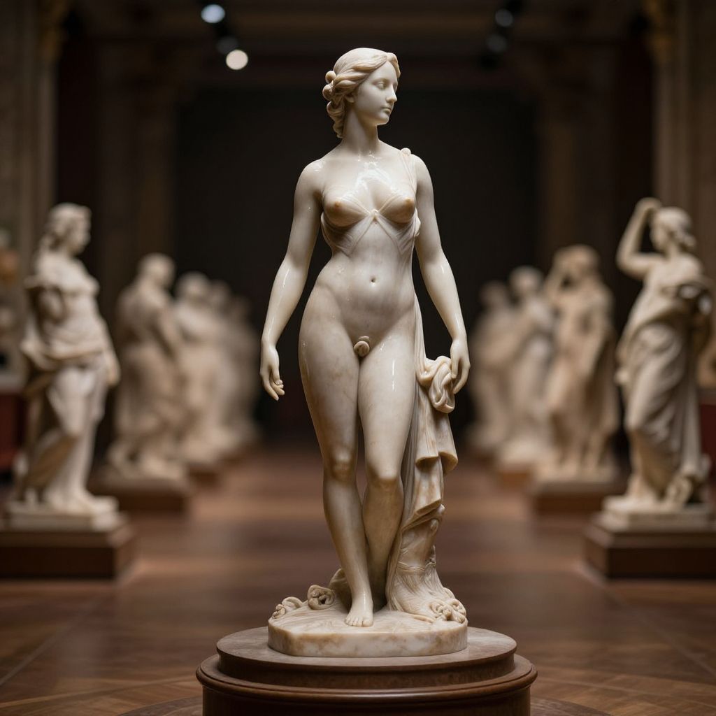 Hyperrealistic art (professional photo of an artistique Sculpture, ample cleavage, ((Biedermeier), (Simple elegance, clean lines, natural materials, muted colors, minimal ornamentation), by (((Carl Spitzweg), Franz Xaver Winterhalter, influenced by the works of Moritz von Schwind) and Louise Seidler).), (Immersive Point of view, clear lines, glossy surface, oily gloss, perfect composition, symmetrically arranged depth of field, dynamic perspective, subsurface scattering), bokeh, decorative, symmetrical, ((dynamic)), inematic film still, (((vignette))), highly detailed, high budget, cinemascope, moody, epic, gorgeous, (prominently standing), (Wide shot taken with a Nikon D850 and Nikon AF-S NIKKOR 105mm f/1.4E ED lens), ( bokeh), wide shot, cinematic light, ambient light, subsurface scattering, ((circular stand, pedestal)), full-body . Extremely high-resolution details, photographic, realism pushed to extreme, fine texture, incredibly lifelike