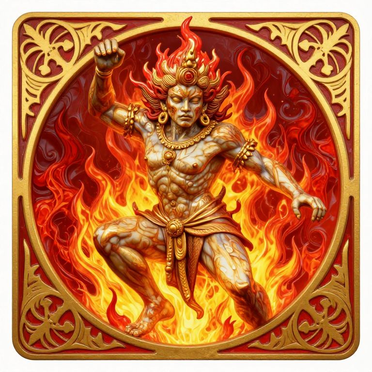 Marble Statue A raging fire spirit. Style is art nouveau with an intricate art nouveau frame. Color scheme is primarily crimson red and golden yellow.,