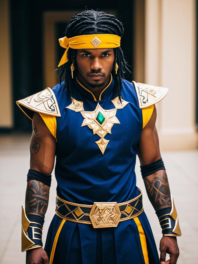 Photo-realistic portrait of a dark-skinned male cosplayer dressed as Angra Mainyu from Fate series, featuring a blue and yellow costume with gold detailing, shoulder armor, and a matching belt. The subject has black braided hair, yellow eyes, and full arm tattoos, wearing a yellow headband and arm guards. The image showcases natural lighting with warm tones and a soft blurred background.
