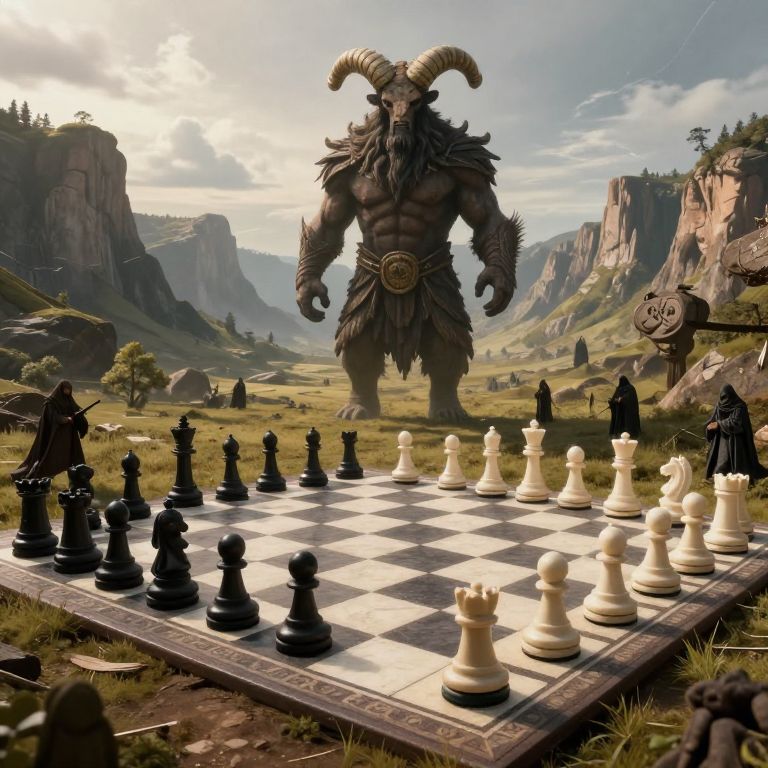 A colossal, horned giant looms over a vast valley where a massive chessboard stretches across the landscape, its squares occupied by cloaked figures standing as living pawns, defying the boundaries of scale and reality.