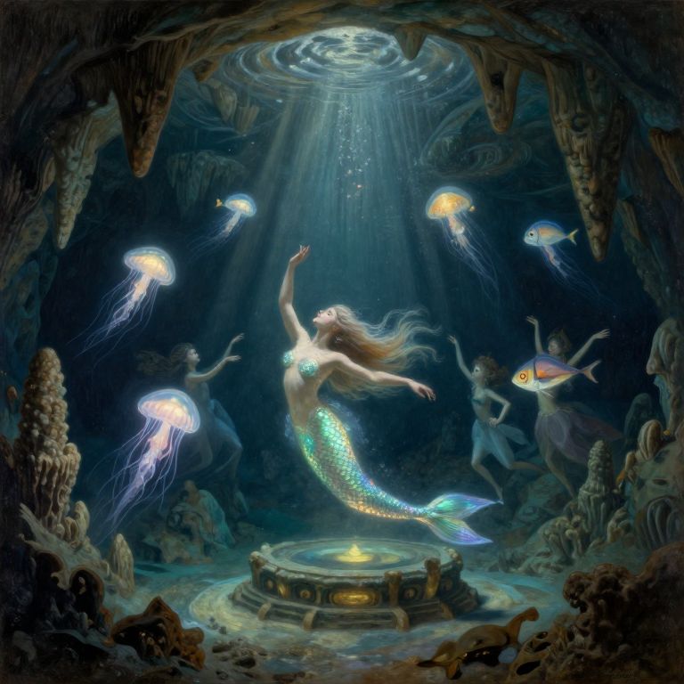 An ethereal oil painting depicting a celestial ballet unfolding in the depths of a mysterious underwater cavern, reminiscent of Gustave Doré's engravings. In the foreground, a graceful mermaid with iridescent scales and long, flowing hair dances around an ancient submerged altar, her movements lit by shimmering bioluminescence. Behind her, a troupe of glowing sea creatures—jellyfish, anglerfish, and lanternfish—perform an intricate, synchronized choreography around the cavern's colossal stalactites and stalagmites. The lighting is soft yet dramatic, casting long shadows that accentuate the otherworldly beauty of this submerged dance. The scene evokes a sense of wonder, mystery, and enchantment while capturing the mesmerizing interplay between light and shadow in this hidden underwater realm.