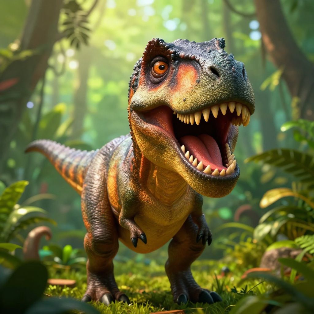 Photorealistic CGI of a excited, orange-and-green dinosaur with sharp teeth, standing in a sunlit, lush forest with ferns and trees.