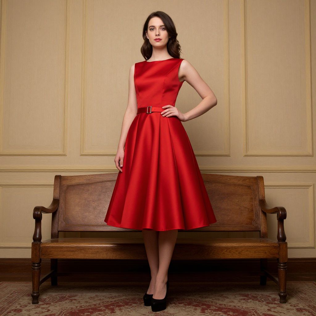 Photograph of a slender, fair-skinned woman with dark brown, wavy hair standing in front of a beige, paneled wall. She wears a sleeveless, knee-length, bright red satin dress with a narrow belt and black high-heeled shoes. Her left hand rests on her hip, and she gazes directly at the camera with a slight smile. She stands in front of an antique, wooden bench with dark brown arms and a cushioned seat. The floor features a patterned, red and beige rug. The overall style is classic and elegant, with a focus on the vibrant red dress.