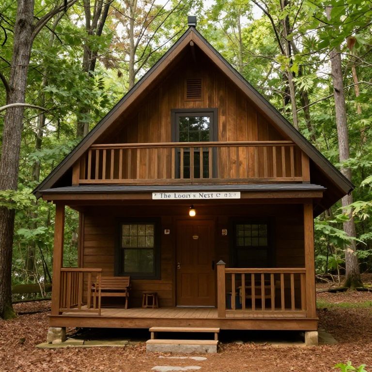 Photograph of a rustic, wooden cabin with a sign reading "WELCOME TO THE CABIN," set in a lush, green forest.