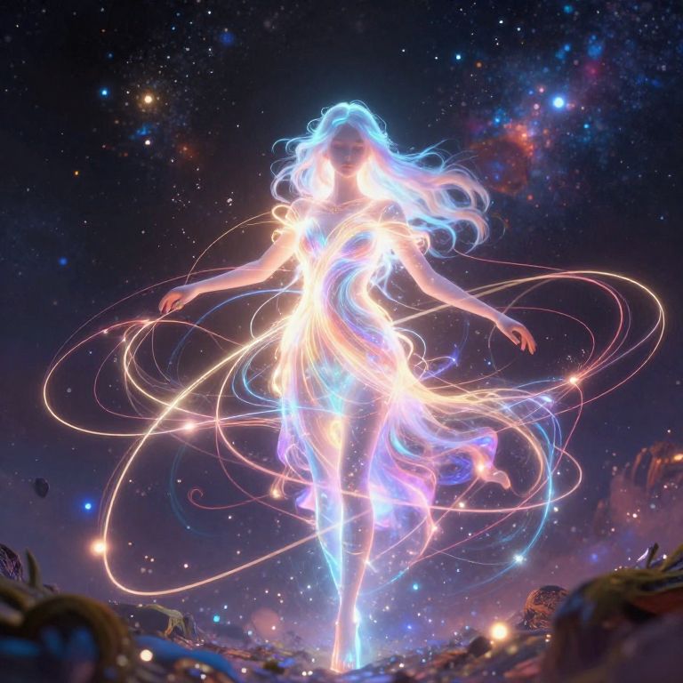 This digital artwork depicts a glowing, ethereal figure with long, flowing hair illuminated in bright blue and white lights. The figure, who is androgynous and has a slender, graceful physique, is surrounded by swirling, neon-like lines that extend from their outstretched arms and legs. The background is a starry night sky with vibrant, colorful nebulae, adding to the celestial atmosphere. The figure's form is semi-transparent, blending with the cosmic backdrop. The ground below is dark and rocky, contrasting with the luminous figure. The image has a magical, otherworldly quality, combining elements of science fiction and fantasy.