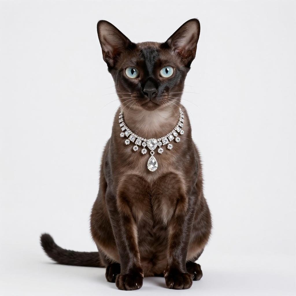 Luxurious studio portrait of a Oriental Shorthair cat sitting upright, glossy dark fur, wearing an ornate sparkling diamond necklace, clean white background, high-end fashion pet photography, high resolution, ultra-detailed