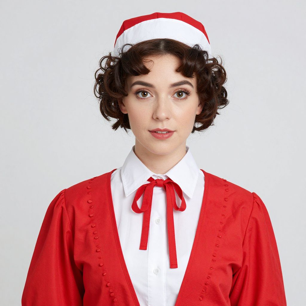 Photograph of a fair-skinned woman with short, curly brown hair wearing a white and red nurse's uniform, white hat, and red ribbon tie
