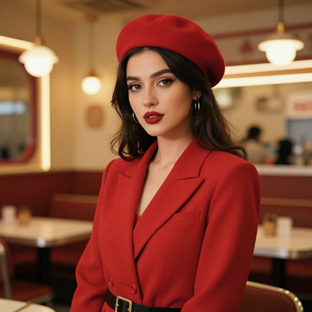 Portrait of a young woman wearing a bold red beret and matching red blazer with a black belt, posing in a warmly lit restaurant interior with a retro aesthetic. The woman has dark hair, red lipstick, winged eyeliner, and hoop earrings, highlighting a fashionable and sophisticated look.