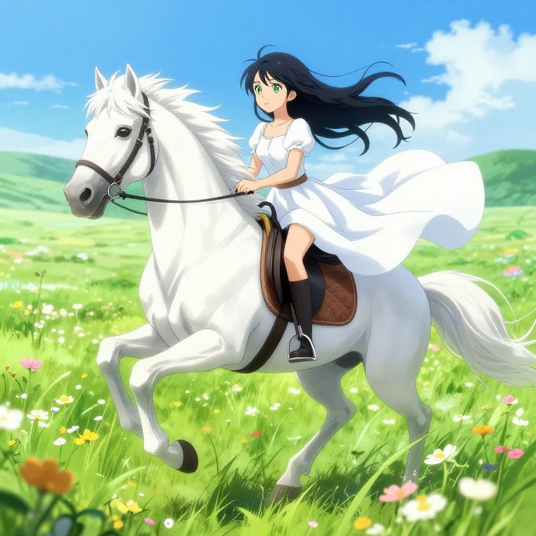 Anime girl with green eyes riding a majestic white horse through an enchanted meadow, wildflowers in bloom, flowing dress fluttering in the breeze, vivid natural colors, dynamic and dreamy composition, detailed anatomy and realistic lighting highlights.