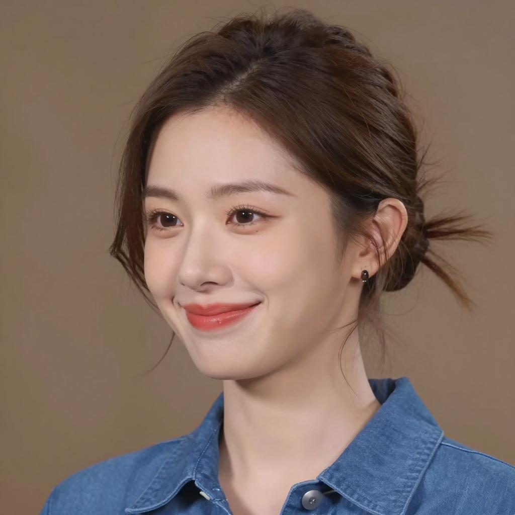 Portrait of a young East Asian woman with long black hair wearing a blue shirt and a silver ring on her finger. She has a white facial mask applied on her face and is gently touching her cheek. The background features a dark green door and a white wall. The woman has a slight smile and a relaxed expression.