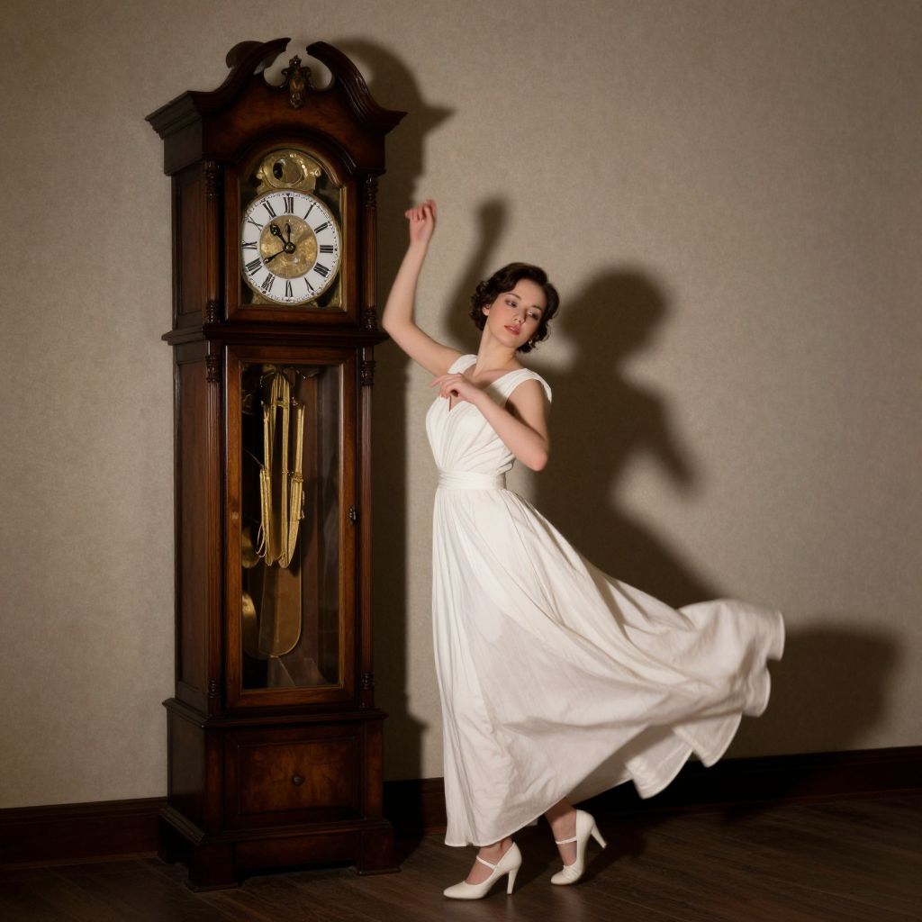 A vintage-style illustration depicts a woman in a flowing white dress standing beside an ornate wooden grandfather clock, her shadow cast dramatically against the wall as the clock's hands seem to dance, creating a surreal and timeless atmosphere with a touch of whimsical, computer-generated artistry.