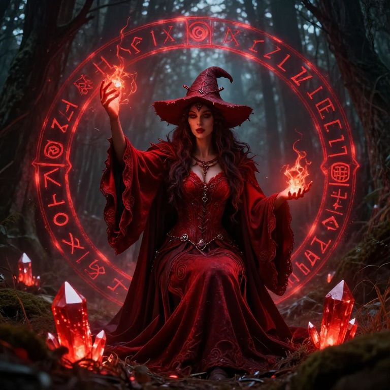 Red witch weaving dark magic in a mystical forest clearing, surrounded by ancient runes and glowing red crystals, dramatic lighting, fantasy art style, Dungeons and Dragons theme, intricate robes and fiery aura, atmospheric and mysterious