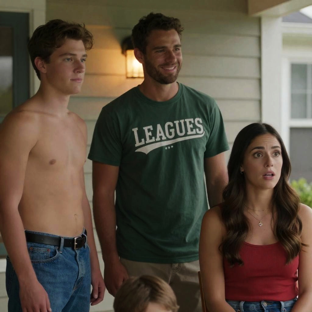 Photograph of four people on a porch. Central man in green shirt, smiling, interacting with shirtless young man on left. Young woman with dark hair in red dress on right, looking surprised. Small child's head near central man. Background includes window and door.