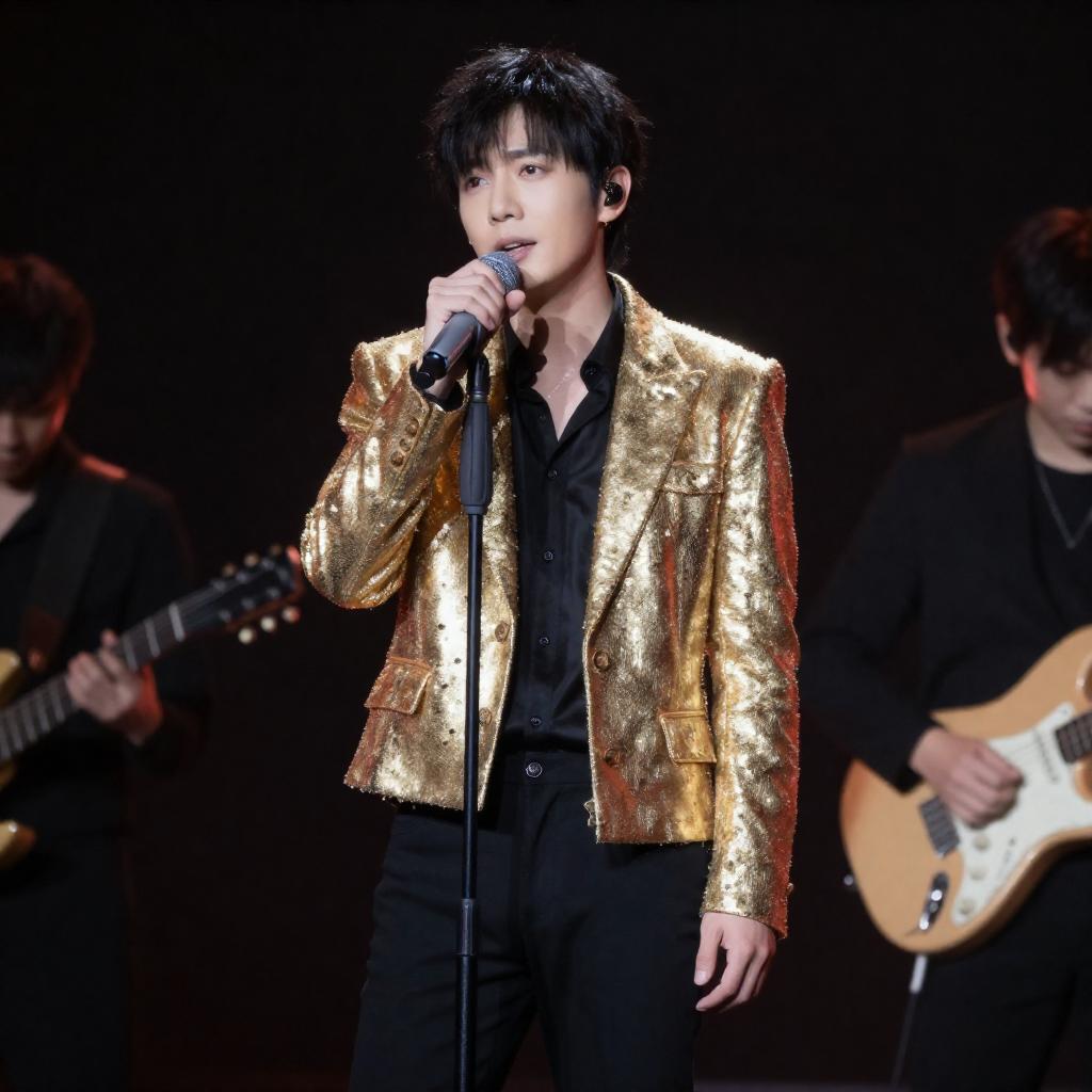 Photograph of a male singer with dark hair and black leather jacket, sitting on a stool, holding a microphone, surrounded by an audience of women in white and black dresses. Background includes a guitarist and other audience members. Singer's expression is focused, with a microphone stand in front of him.