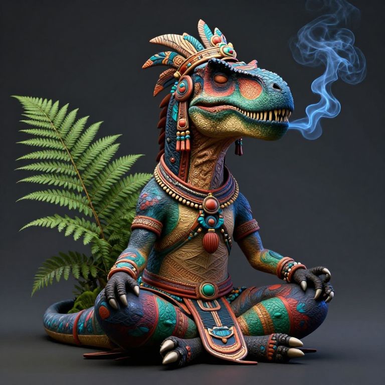 In this highly detailed and stylized image, a Tribal T-rex is depicted in a meditative pose, exuding a sense of spirituality and mysticism. The T-rex, adorned with intricate patterns and vibrant colors, sits cross-legged on the ground, with its eyes closed and hands resting on its knees. Its head is decorated with elaborate headdress and necklaces, adding to its regal appearance. The T-rex's body is covered in a mix of blue, green, and red hues, with detailed textures that give it a lifelike quality. A cloud of blue smoke drifts from its mouth, enhancing the mystical atmosphere. To the left of the T-rex, a large fern leaf adds a touch of nature to the scene. The overall composition is balanced, with the T-rex centrally positioned and the elements arranged in a harmonious manner, creating a sense of depth and perspective. The image is rich in detail, with a focus on the interplay of colors, textures, and shapes, making it visually captivating and immersive.