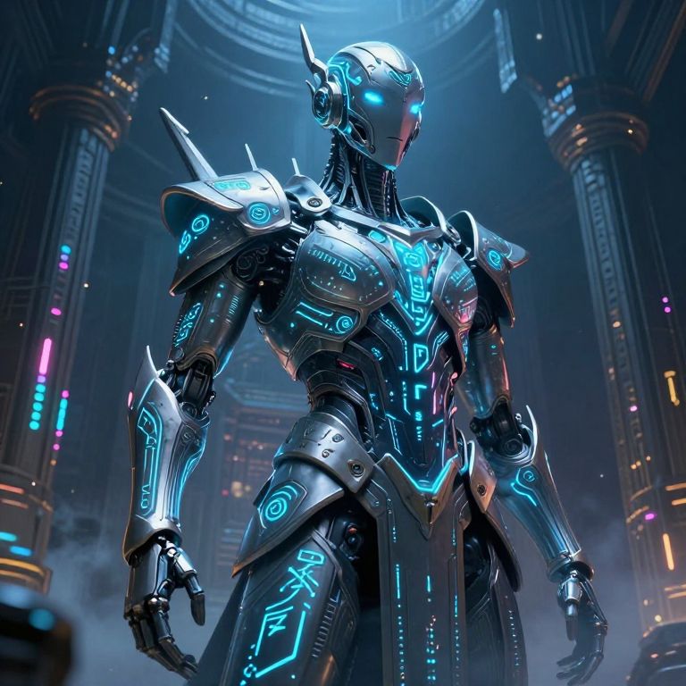 Photorealistic CGI image of a futuristic, humanoid robot standing in a high-tech, illuminated cathedral-like environment. The robot has a sleek, metallic blue and silver exterior adorned with glowing, neon-blue circuit patterns and angular, spiked shoulder plates. Its head features a helmet-like design with a single, bright blue eye-like light. The background showcases tall, ornate columns with colorful neon lights, adding to the sci-fi ambiance. The robot's posture is imposing, with arms slightly bent and glowing blue lines highlighting its muscular structure. The scene is bathed in a cool blue light, creating a high-tech, otherworldly atmosphere.