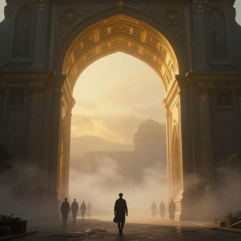 Suspended between worlds, a monumental archway bathes in ethereal light, its golden glow casting whispers of mystery and wonder, while figures traverse the misty expanse below, their steps echoing the quiet promise of discovery amidst the enigmatic hum of infinite possibilities.