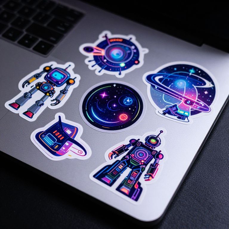 Sticker pics of glossy, holographic stickers arranged artistically on a laptop surface, featuring futuristic designs such as robots, space themes, and abstract shapes, enhanced by vibrant neon glows and a dark modern setting.