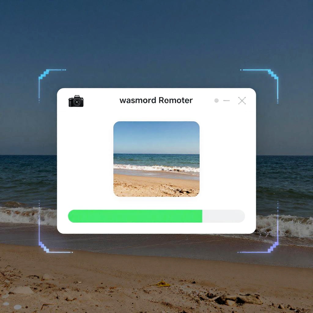 Stock image watermark remover software interface, futuristic design with holographic elements, pixel-perfect clarity, displaying progress bar removing watermark from beach photo, creative blend of technology and photography aesthetics under soft lighting