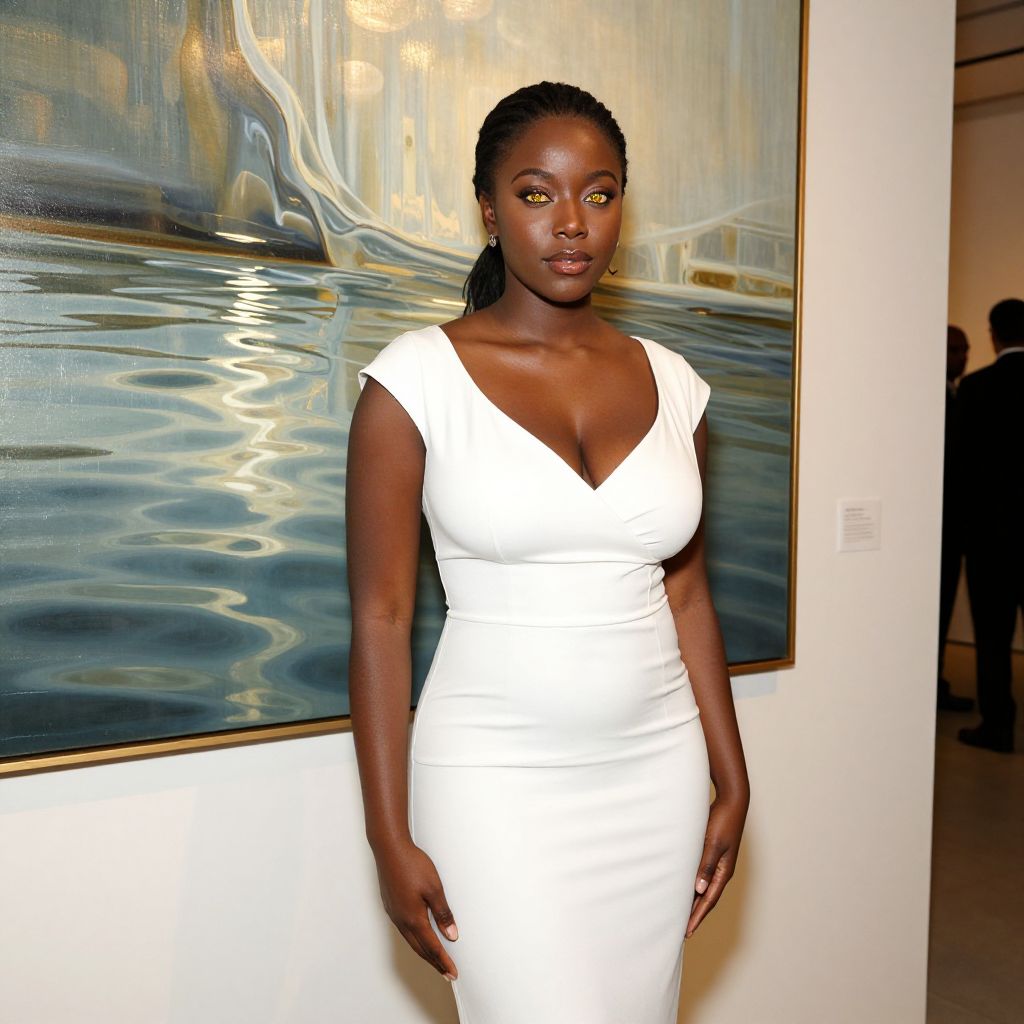 A bold and stylish woman with deep brown skin and sparkling amber eyes wearing a white midi dress designed as an elegant costume for a modern art gallery opening, standing in front of a large abstract painting of flowing water, the dress reflecting the ambient light from gallery lamps, the setting lit with soft white and gold tones. The woman has big tits and cute face