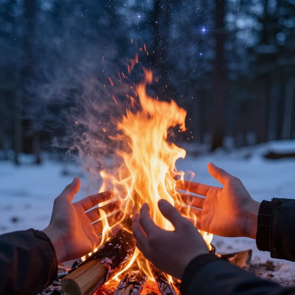 A person warming hands by fire outdoors, campfire crackling under starry sky, detailed flames and smoke, cold snowy forest background, close-up on hands radiating warmth
