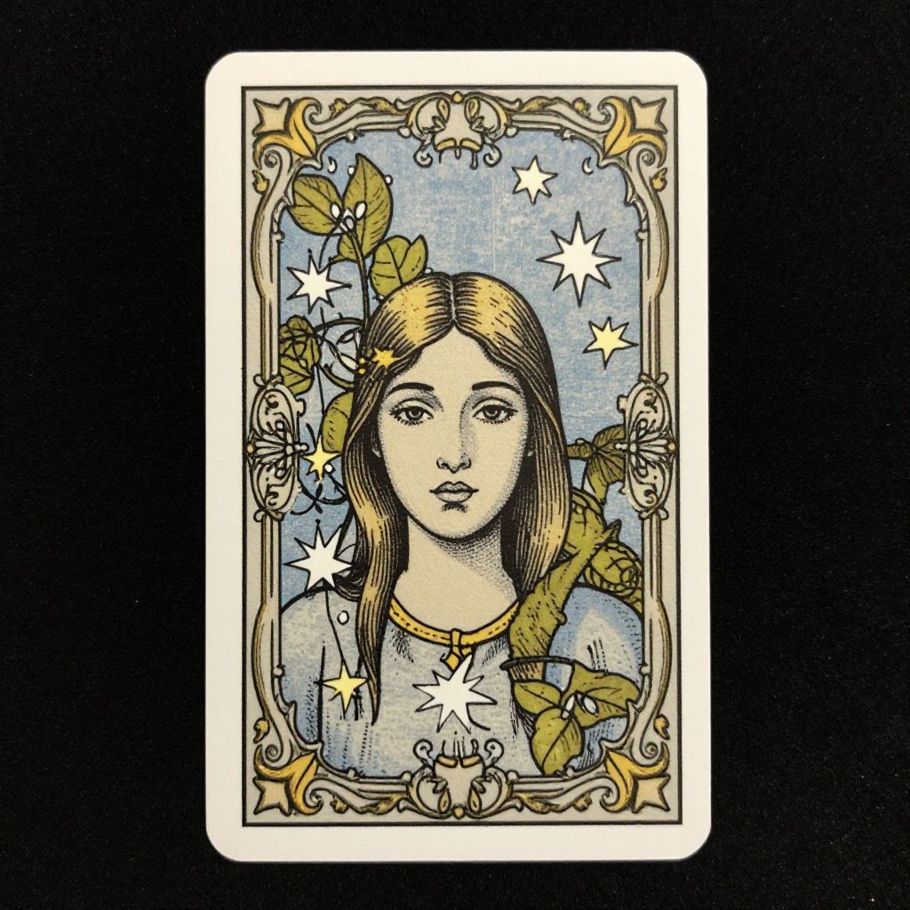 A tarot card with an ornate frame featuring a woman's face surrounded by leaves and stars.