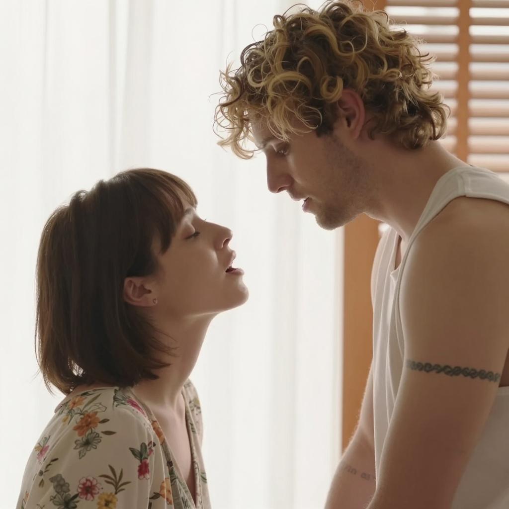 Close-up of a young caucasian man and woman in an intimate moment indoors. The man has curly blonde hair, a white sleeveless shirt, and a geometric tattoo on his upper left arm. He leans in closely towards the woman, who has short brown hair and is wearing a floral patterned top. The woman has her eyes closed and mouth slightly open, leaning slightly backward. Natural light filters through a window with wooden blinds in the background.