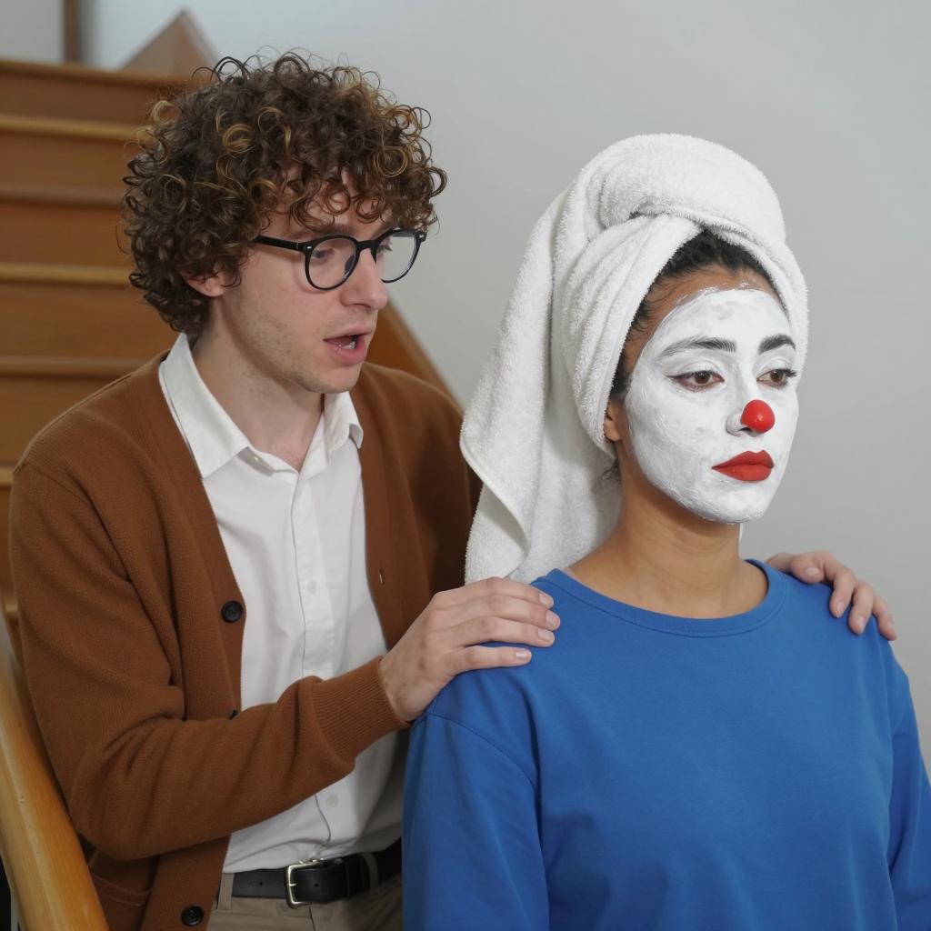 Two people on stairs. Man with curly hair, glasses, brown cardigan, white shirt, open mouth, hand on woman's shoulder. Woman with white towel on head, blue shirt, face painted white, red nose, looking to the right. Man's hand on woman's shoulder. Background includes wooden stairs and white wall.