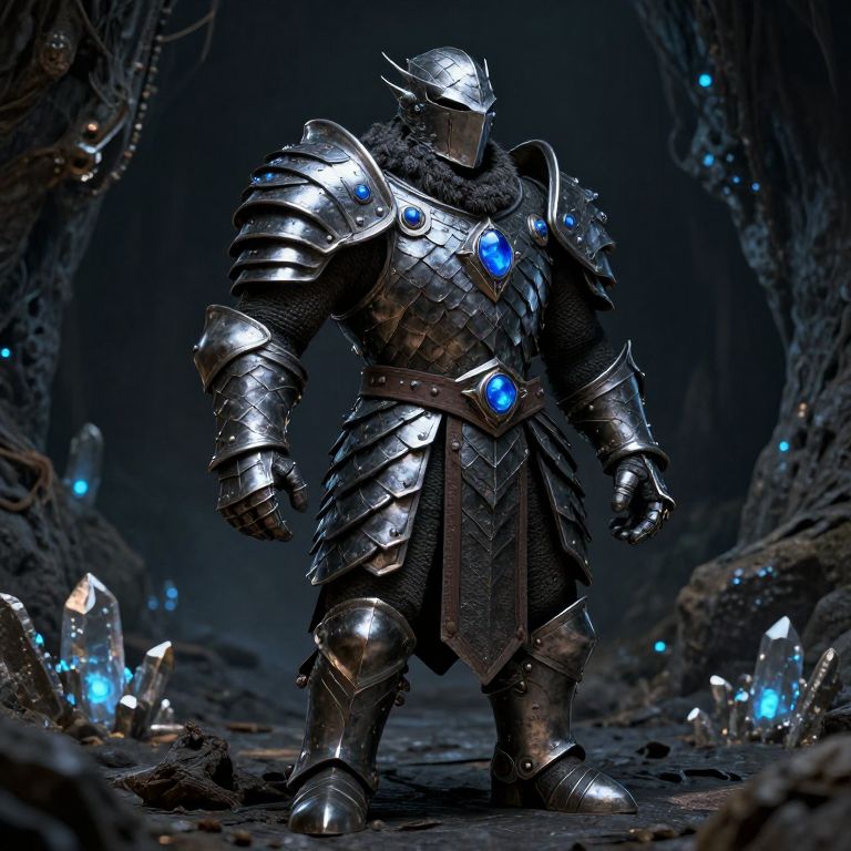 Fantasy dwarf armor designed for underground battle, composed of layered metal scales, glowing blue gems embedded in the chestplate, heavy gauntlets and boots, rugged textures, set in a dark cavern with glowing crystals, dark fantasy mood, ultra detailed.