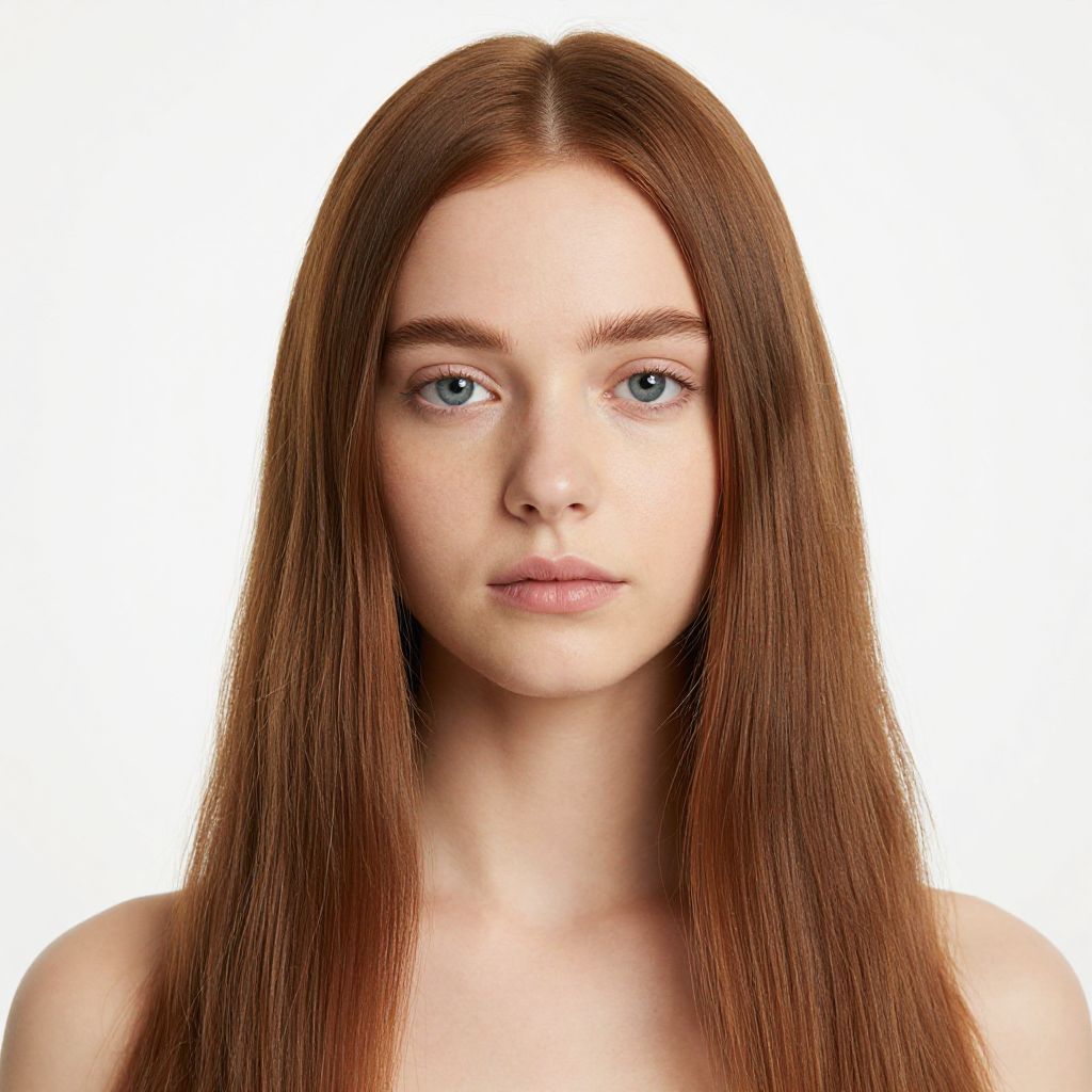 Photograph of a young woman with long, straight, auburn hair cascading past her shoulders. She has fair skin, blue eyes, and a neutral expression. Her eyebrows are naturally arched, and she's wearing minimal makeup, highlighting her natural beauty. The background is a plain, bright white, making her hair and face the focal points. She's wearing a strapless top, but it's mostly out of frame.