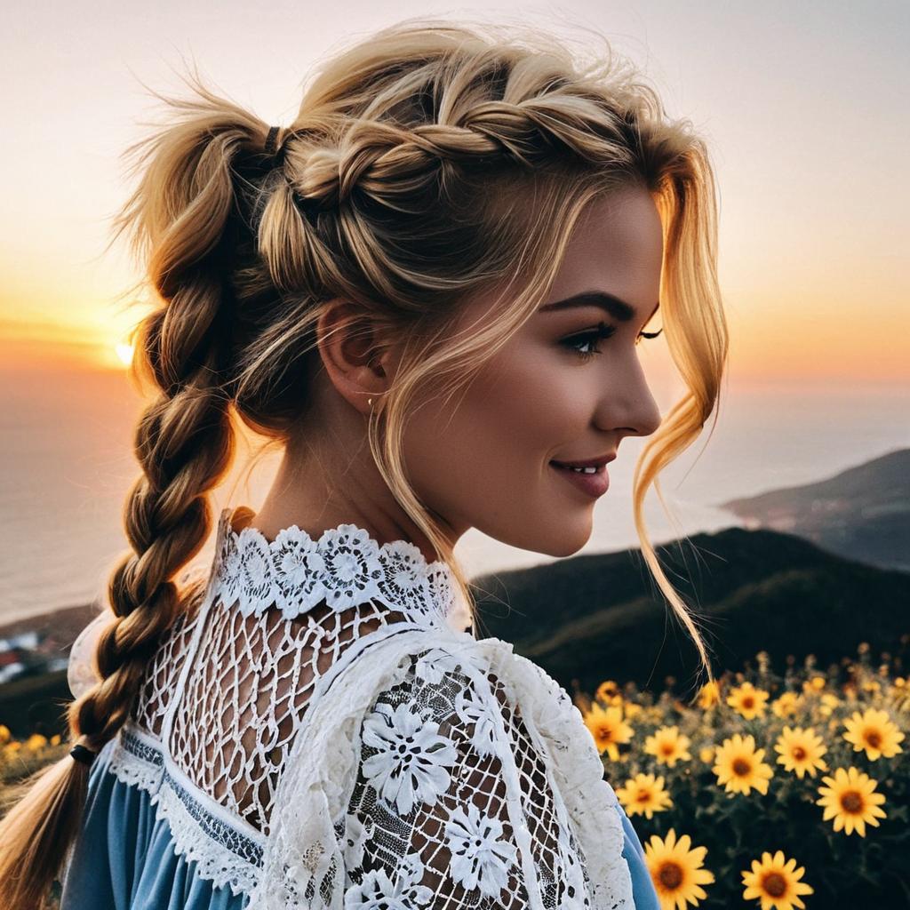 Best quality, masterpiece, extremely detailed, detailed background, 1girl, solo, yellow hair, blue eyes, braid, wavy hair, fluffy hair, ponytail, french braid, blush, smile, capelet, lace trim, bodice, sunset, dusk, scenery, high place, horizon, wind, wind blow, flowerbed, hands up, depth of field, bokeh
