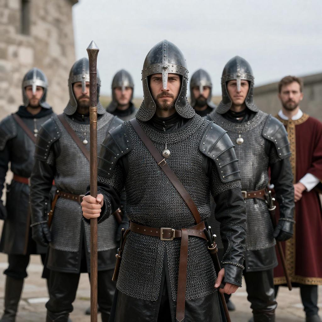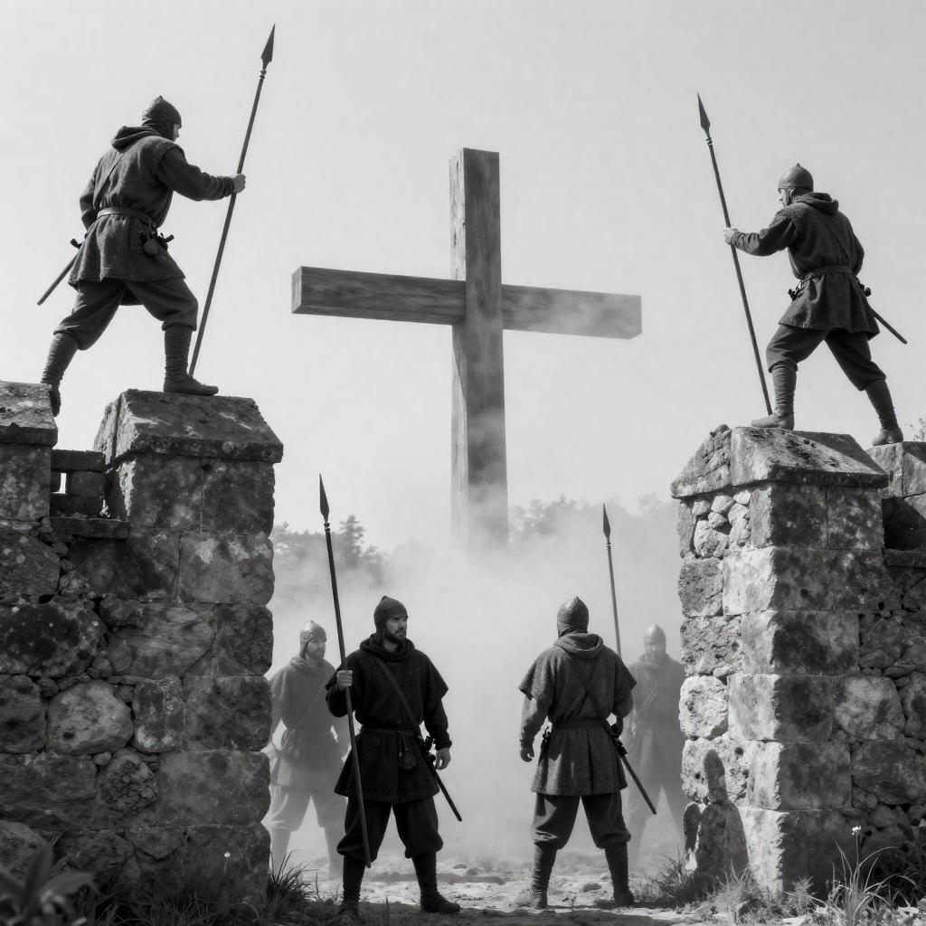 Black-and-white photograph of a medieval battle scene. Soldiers with spears climb large stone walls, attacking from the left and right. One soldier is on top of the left wall, another on the right. Smoky atmosphere. Four soldiers on ground, holding spears. Intense expressions. Stone wall with large, wooden crossbeam in background.