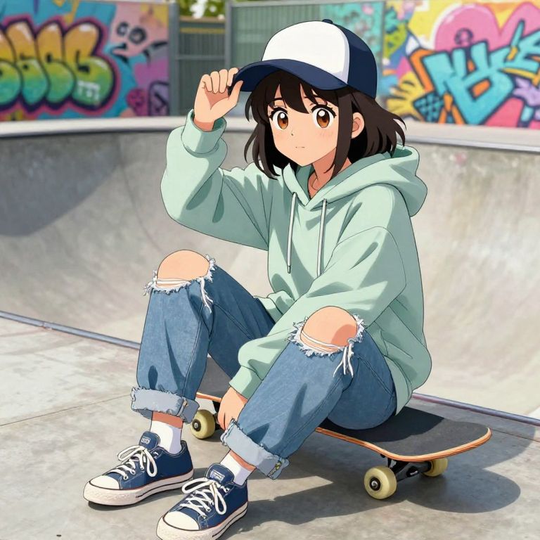 Anime girl tomboy wearing a baseball cap, oversized hoodie, ripped jeans, sitting on skatepark ramp with a skateboard, expressive eyes, energetic atmosphere, colorful graffiti art around