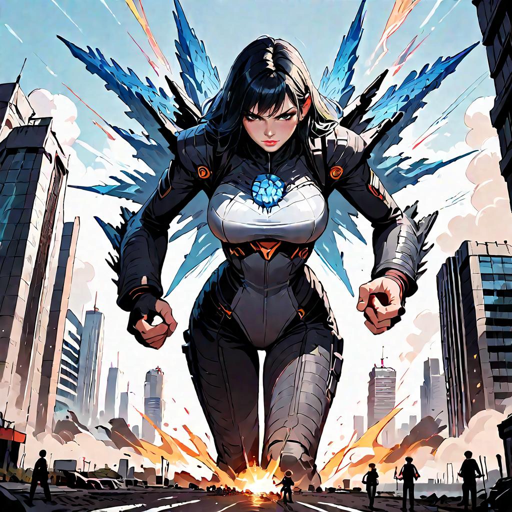 Score_9, score_8_up, score_7_up, source_anime, anime artwork, all intricate, extremely detailed wallpaper, best quality, masterpiece, detailed background, buildings, dynamic, cityscape, ADDCOMM1girl, ultragirl, giantess, full body, fighting stance, standing, detailed multicolored bodysuit, angry, looking away, energy ball on hand, attacking, gem on girl's chest, detailed face, ADDCOLGodzilla attacking