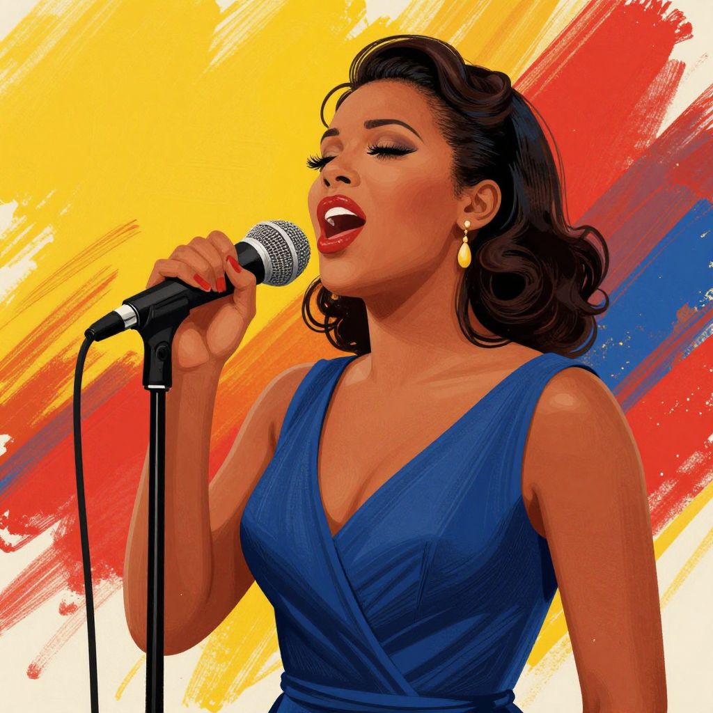 A vibrant digital illustration captures a soulful moment of a woman singing into a microphone, her expression radiating passion against a bold, abstract background featuring streaks of yellow, red, and blue, reminiscent of Billie Holiday's iconic \"Lady Sings The Blues\" theme.