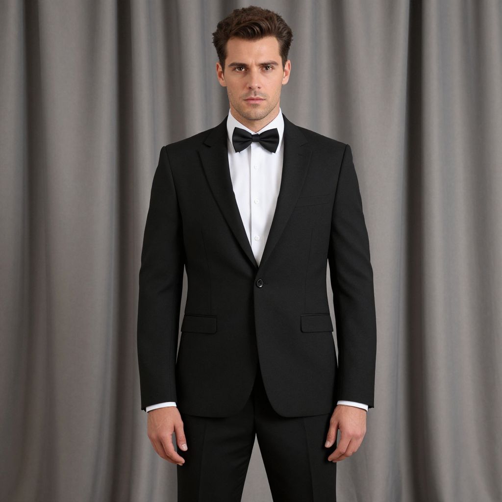 Photograph of a young Caucasian man with short, dark brown hair, standing against a backdrop of gray, floor-length curtains. He is wearing a classic black tuxedo with a white dress shirt and a black bow tie. His expression is neutral, with a slight gaze directly at the camera. The tuxedo is well-fitted, highlighting his average build. The lighting is even, with no visible shadows, emphasizing the formal and elegant nature of his attire. The overall composition is simple, focusing on the subject's formal appearance.