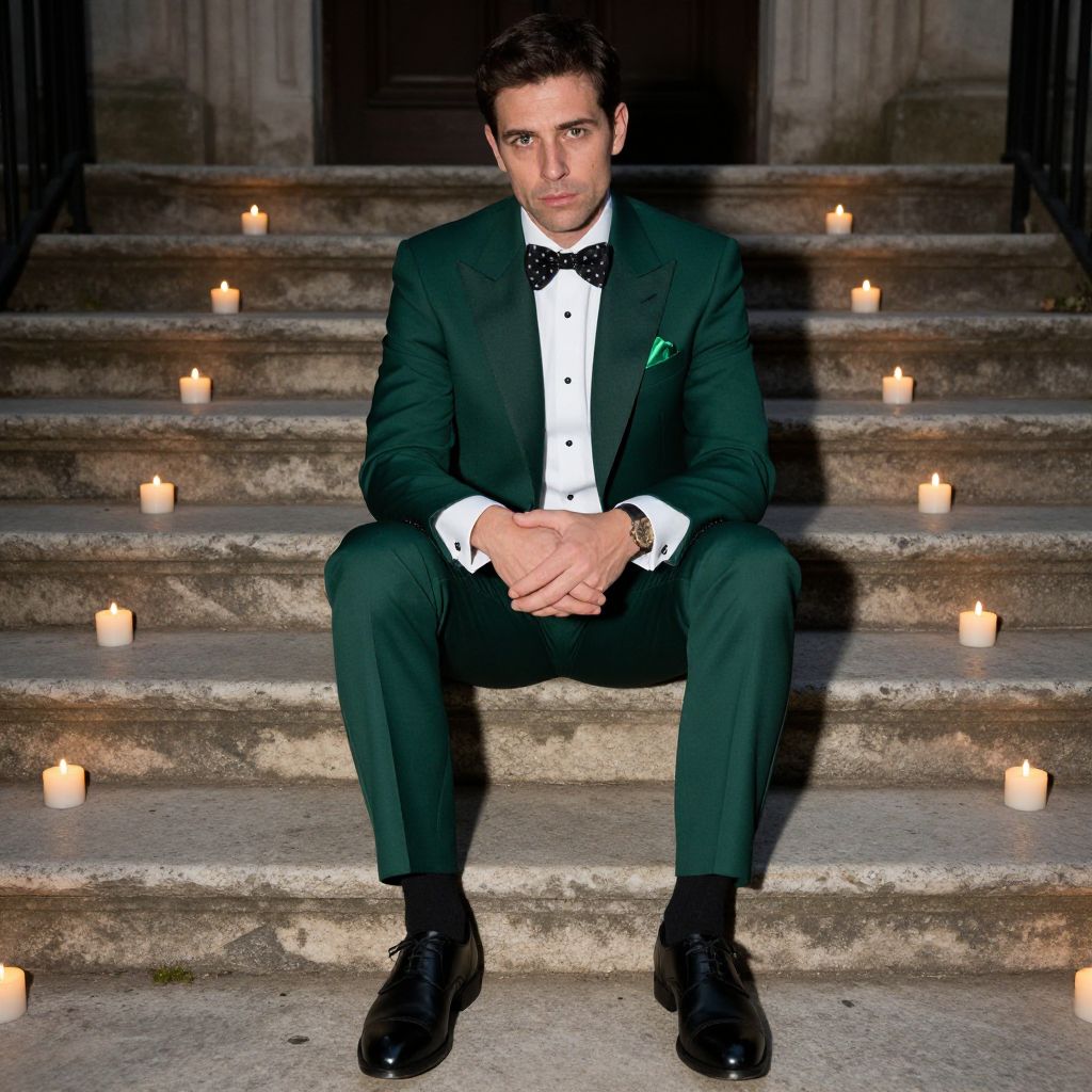A man, emerald green tuxedo, satin lapels, white button-up shirt, black and white polka dot bow tie, black leather monk strap shoes, matching green pocket square, weathered stone steps, flickering candles at dusk, camera obscura style, contemplative expression Man has masculine face and piercing eyes