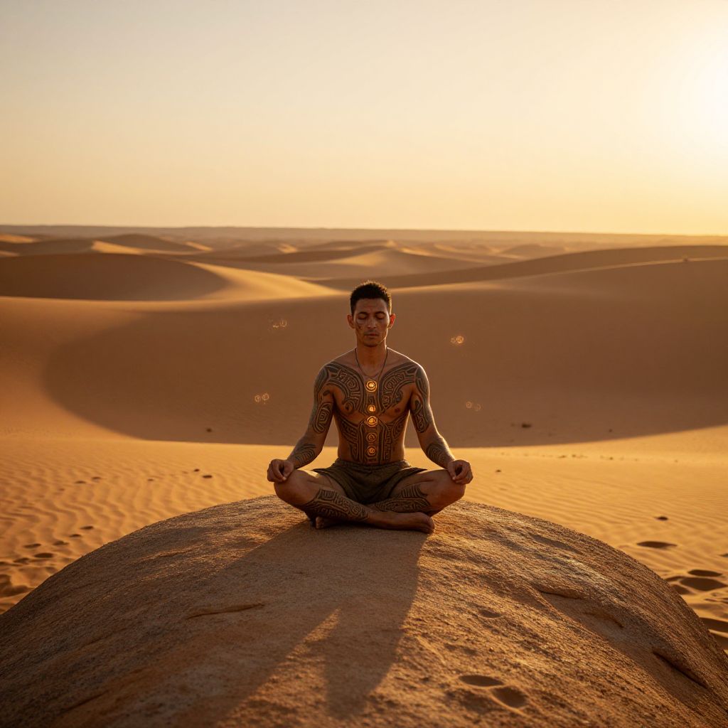 A mystical desert landscape with a lone man with 3 eyes meditating on a rocky outcrop, golden hour sunlight casting long shadows, intricate tribal tattoos covering his body, ancient symbols glowing softly around him