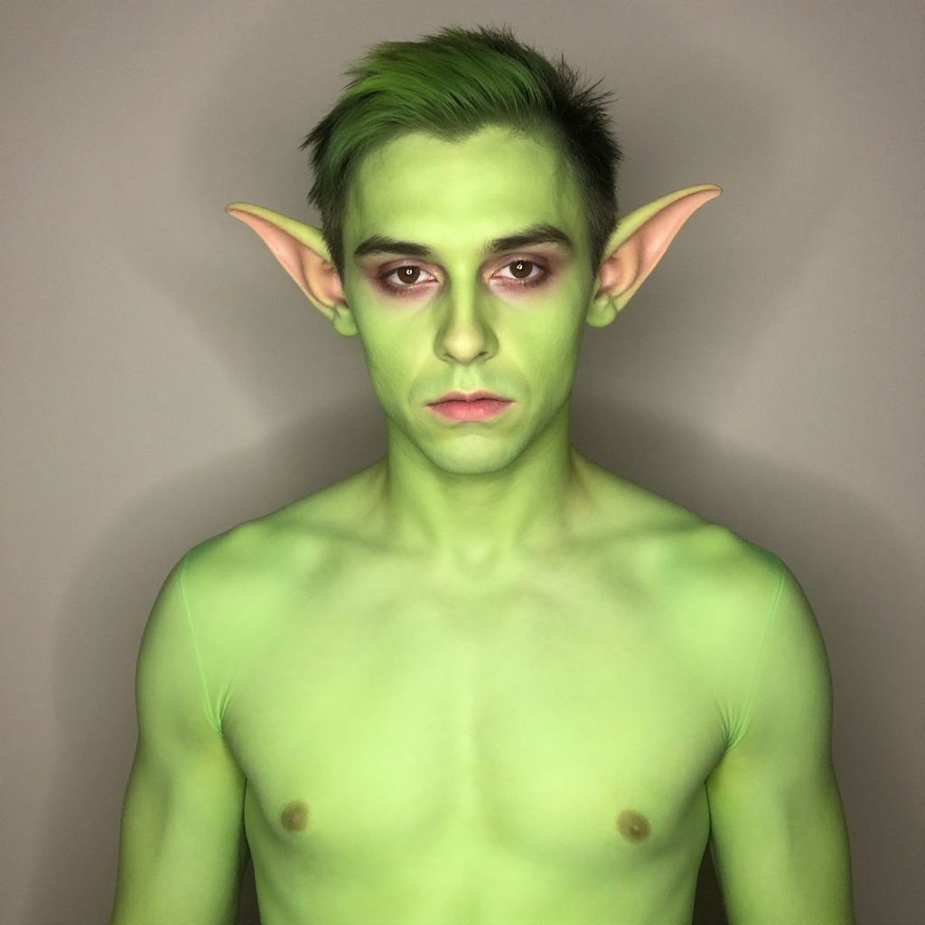 "adult green goblin costume, solo, 1boy, male focus, alien, looking at viewer, green skin, colored skin, realistic Realistic photo of casual sexy person with pretty face"