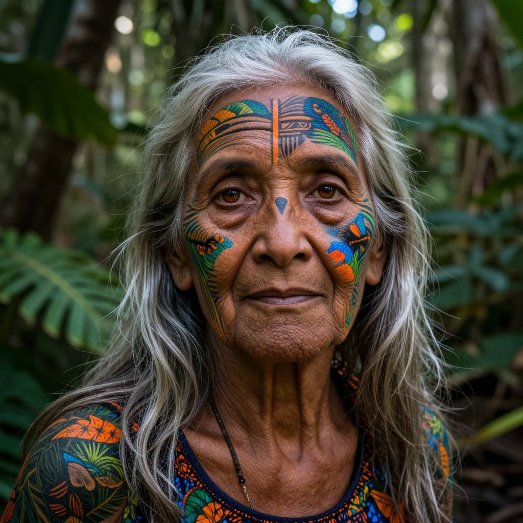 Craft a detailed portrait of an elderly woman with weathered skin, deep-set eyes, and flowing silver hair. Her face is adorned with intricate tribal patterns that seamlessly blend into the vibrant tropical foliage surrounding her - lush greens, vivid oranges, and electric blues. Within her gaze, glimpses of wild flora and fauna emerge, hinting at a profound connection to nature's mysteries. Dappled sunlight filters through the canopy above, illuminating her serene yet knowing expression, suggesting an air of centuries-old wisdom and untold tales.