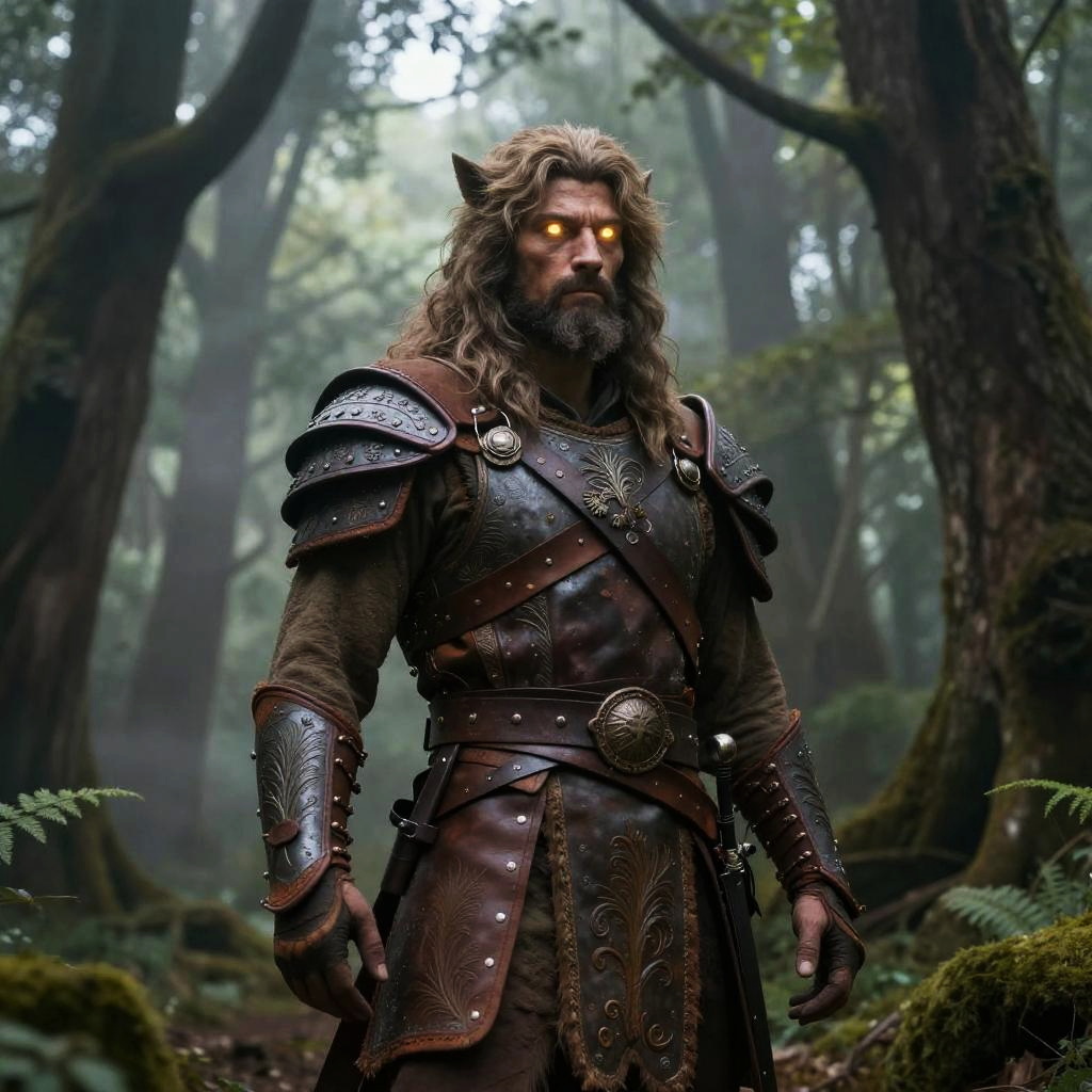 Remus as a mythical forest guardian, standing tall among ancient trees, glowing eyes illuminating the misty woods, wearing rustic leather armor with intricate nature-inspired designs, a gentle but powerful presence, soft ethereal light filtering through leaves