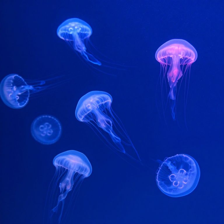 Glowing translucent jellyfish gracefully drift in a deep blue ocean, their bioluminescent bodies emitting vibrant hues of blue and pink, creating a mesmerizing underwater ballet.