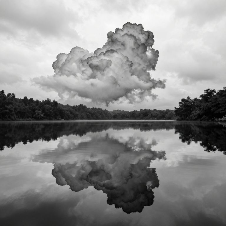 This black-and-white photograph captures a serene lake reflecting a dramatic, cumulus cloud formation in the sky. The cloud, detailed with intricate textures and shadows, mirrors perfectly on the still water's surface. The horizon is lined with a dense, dark tree forest, creating a stark contrast against the bright, cloudy sky. The overall composition emphasizes symmetry and reflection, with the cloud and its mirror image dominating the scene. The image exudes a calm, almost surreal atmosphere, enhanced by the high-contrast monochrome palette.
