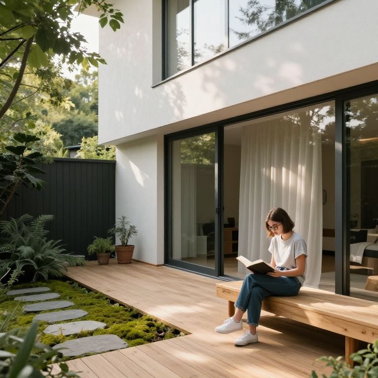 Photograph of a young woman with short brown hair, wearing a white t-shirt, blue jeans, and white sneakers, sitting on a wooden bench outside a modern white house with large black-framed glass doors. She is focused on a tablet in her lap. The setting is a sunlit patio with a wooden deck, green moss, and potted plants. Reflections of trees are visible on the glass doors. The background includes a black fence and lush greenery. The scene exudes a relaxed, contemporary, and natural ambiance.