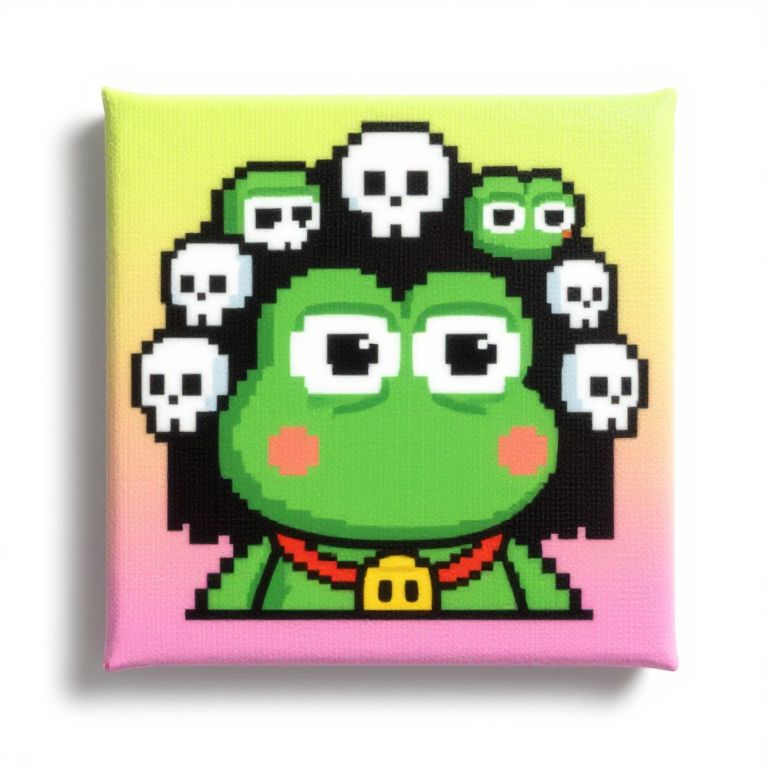Colorful digital drawing of a green frog with red eyes, wearing a blue sleeveless hoodie and gray pants, sitting on a rock, waving at a