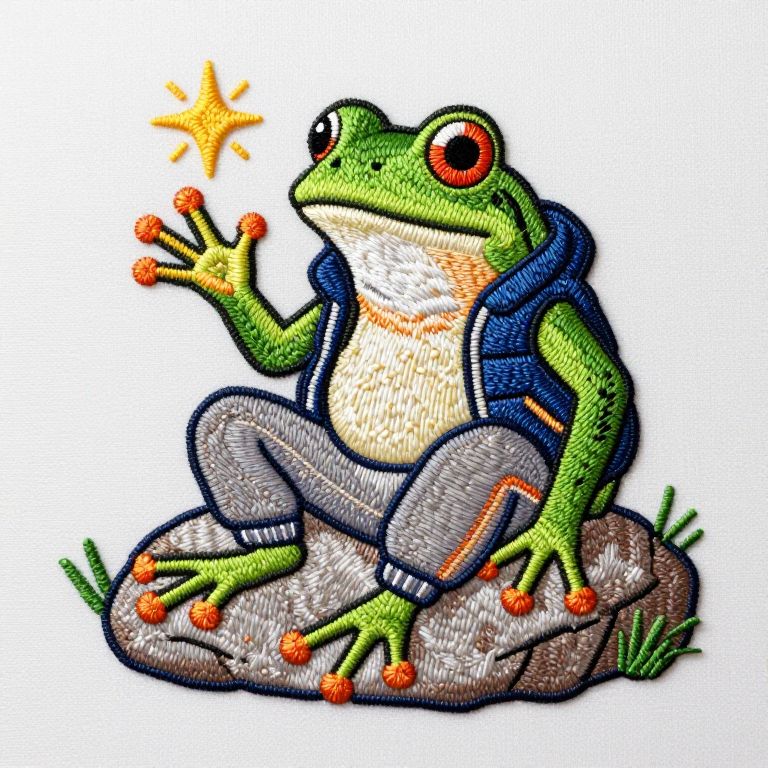 Embroidery Stitch Library Magic illustration A sitting frog on a rock fanning its legs, wearing sweatpants and a body jacket. Magic & Magic,