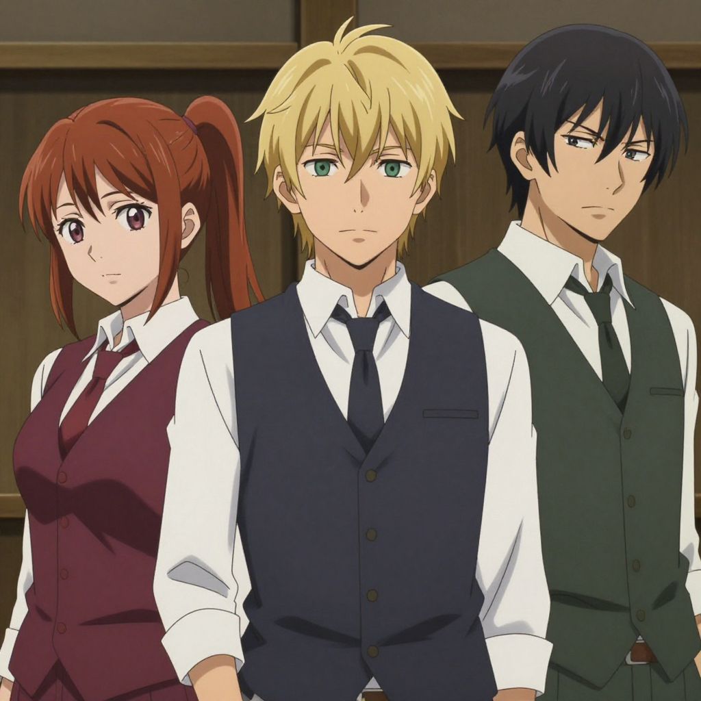 Three anime characters stand side by side, featuring a red-haired woman with a ponytail to the left, a blonde man with green eyes in the center, and a dark-haired man with a serious expression to the right, all dressed in formal attire with vests and collared shirts.