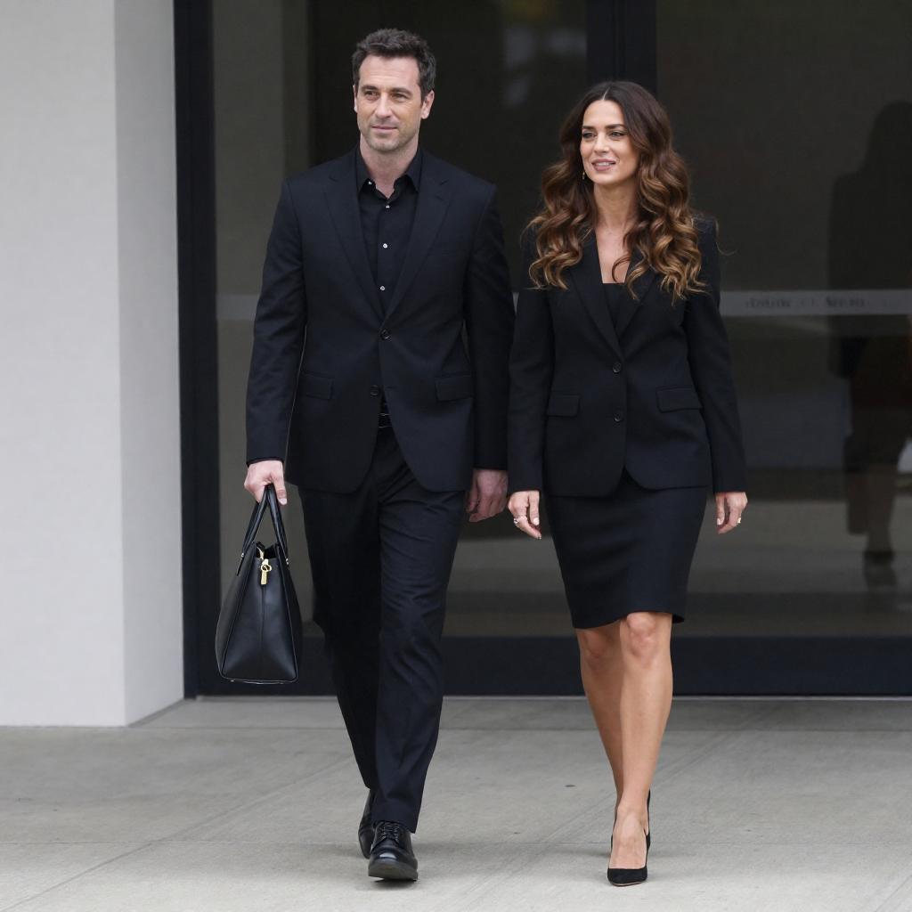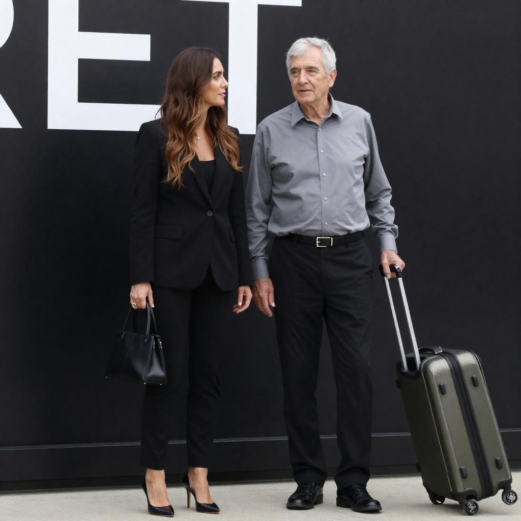 Photograph of a woman with long brown hair, wearing a black blazer, black pants, and black shoes, standing beside an older man with short gray hair, wearing a gray shirt and black pants. She carries a black handbag, while he pulls a green rolling suitcase. They stand in front of a black sign with white .
