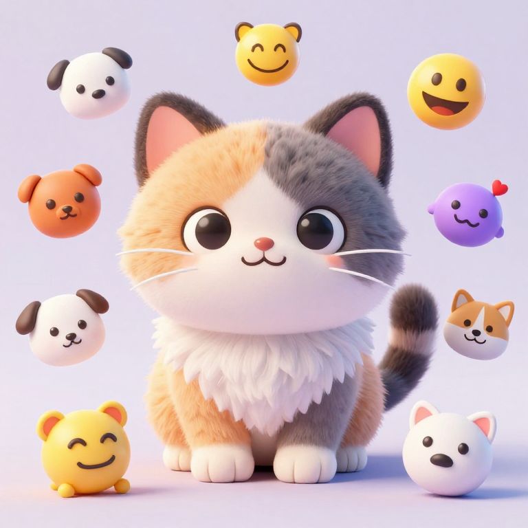 A 3D-rendered image featuring a cute, fluffy cat surrounded by colorful, cartoonish pet emojis, created using RTX On, Cinema 4D, and Octane Render.