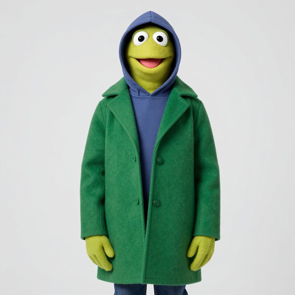 Photograph of a green, anthropomorphic frog-like puppet with large, white, round eyes, a small red mouth, and yellow hands. The puppet wears a dark blue hooded sweatshirt under a long, textured, green wool coat with two visible buttons. The coat has a slightly rough weave texture. The puppet stands against a plain white background, facing forward with a neutral expression. The overall style is reminiscent of a children's puppet from a classic television show, with simple, bright colors and a slightly cartoonish appearance.